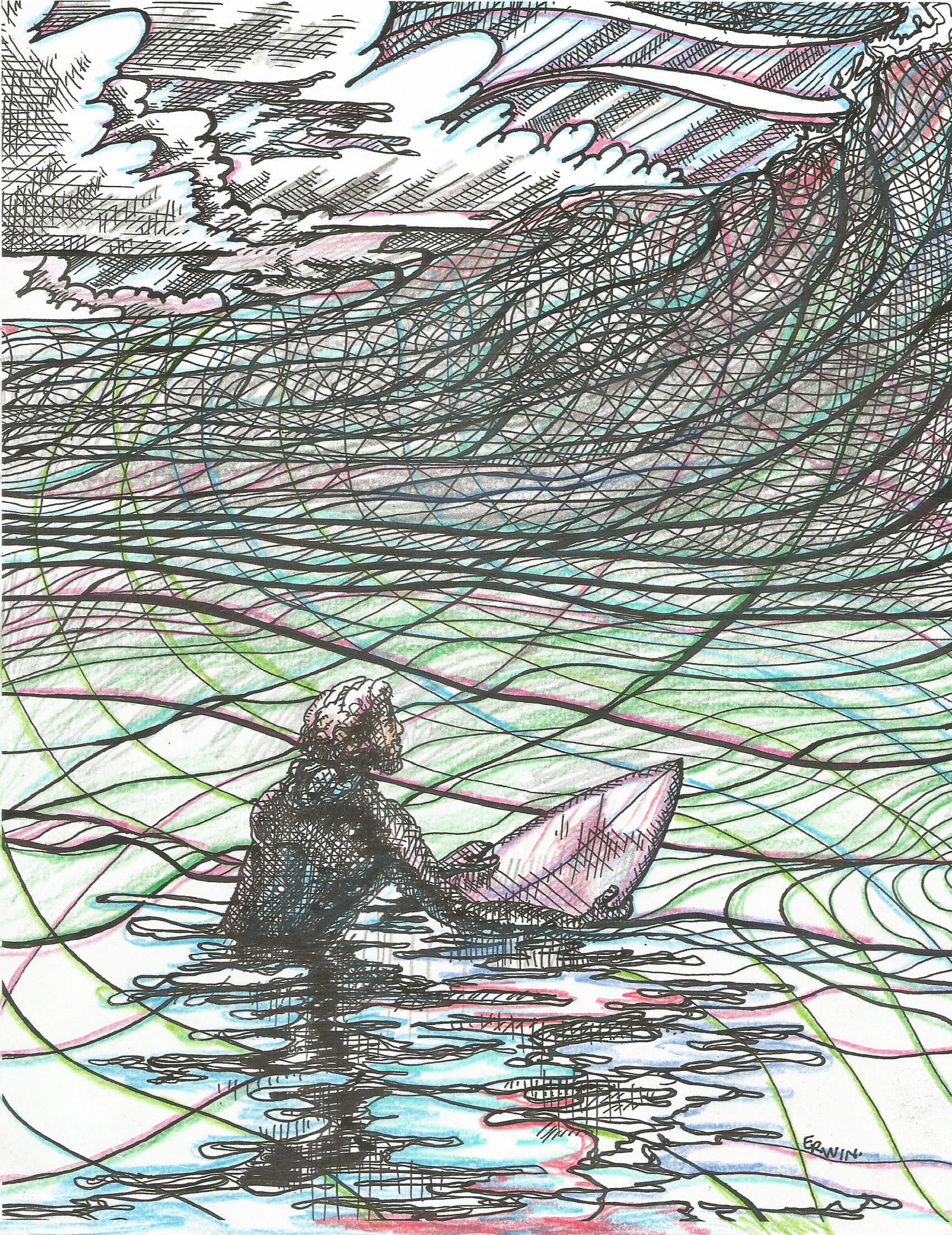 This drawing is from a copy of the original black and white, which I (and at one point I was afraid I hadn’t) saved. The colors seem to get muted in the copying process, so I probably got a little over-amped (not unusual). A different mood could be achieved by going with different colors, but, having started with yellow, it got a bit stained-glassy.