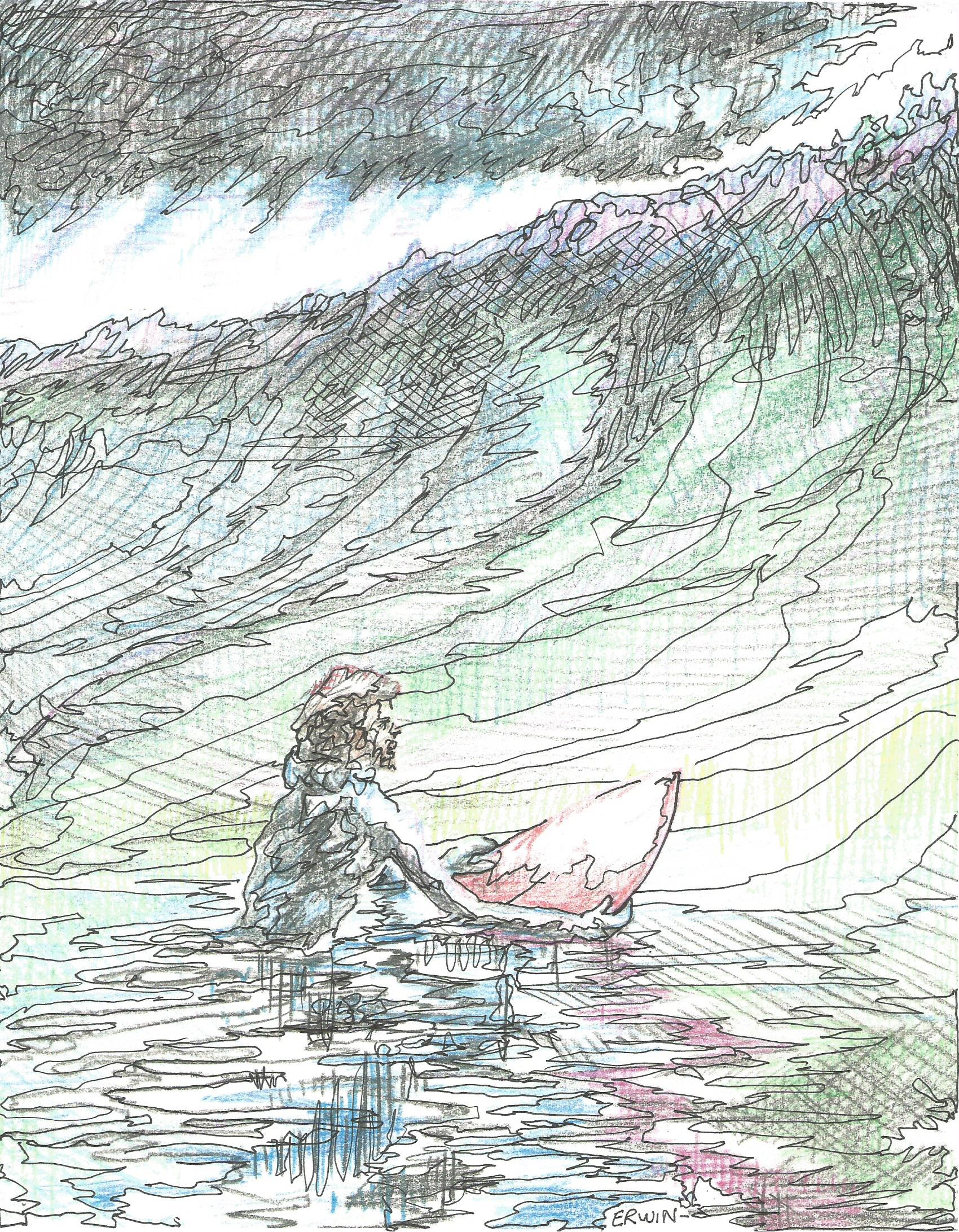 realsurfersreflectionmancolor 001My original thought was to have a darker mood, a surfer swimming in, a wave behind him about to break. I also thought, once I got on the reflected image, that another reflection, high in the wave might be… okay, you’re imagining it now. And, I did want to keep some white space, keep it cleaner. Simpler. I just didn’t. Maybe I couldn’t. However, I spent some time (mostly wasted it) looking for images of a woman in a similar situation, thinking, yeah, triptych, this one on the left, the drawing on the right with a woman, maybe more in the actual wave, that wave breaking the opposite way; and the middle drawing just, simple, the wave between them. Okay, you’re seeing that now. And I’m seeing it.