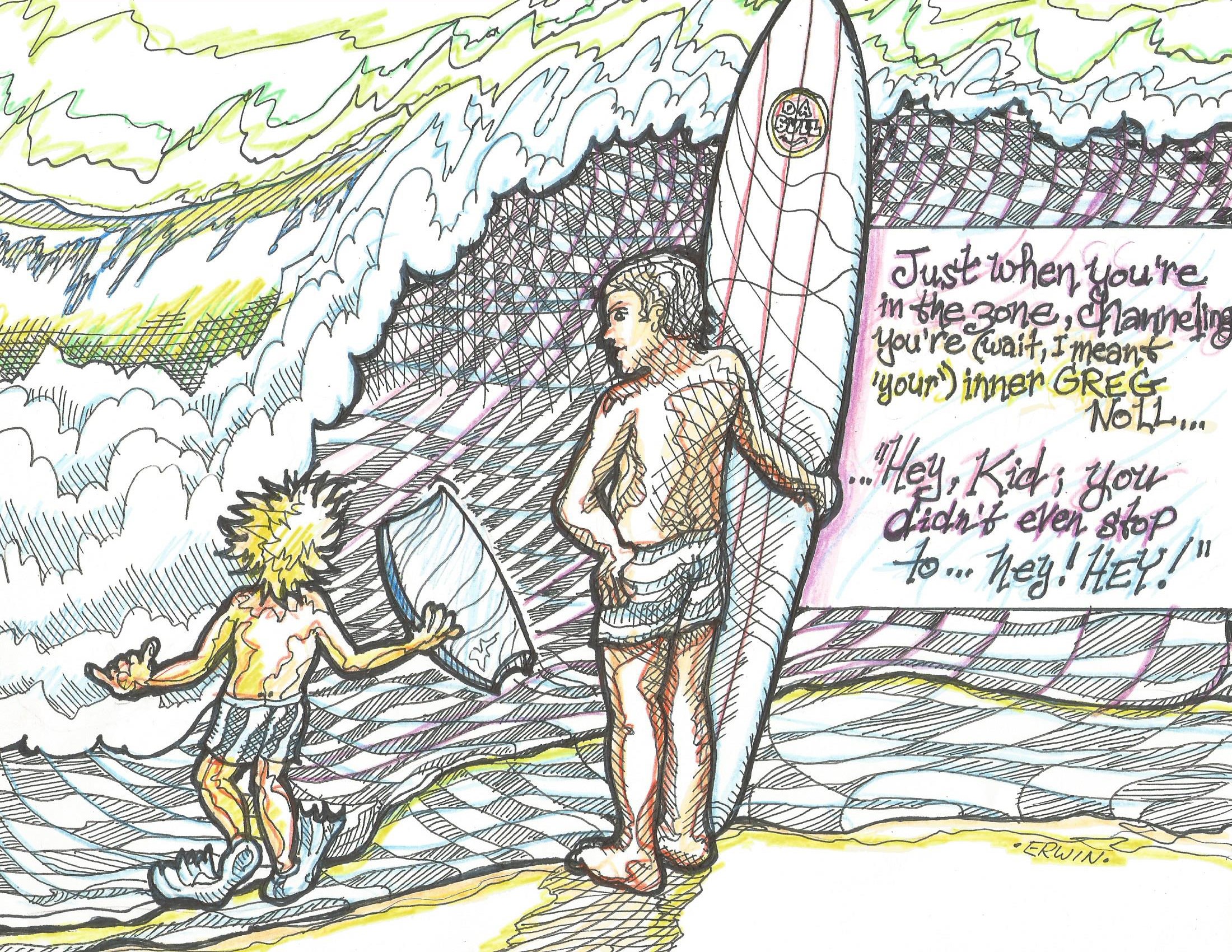 It doesn’t matter what beach you go to, how big the waves are; it’s a part of the mystical ritual to get to the edge, find your inner Greg Noll (forever deified in the photo by John Severson), and prepare for the epic battle/love affair between surfer and sea. And then there’s some kid/freak channeling an inner nine year old John John… and beware, that freak could be some old guy, that weird bit of spittle drooling onto his soul patch might just be froth. So, froth on!