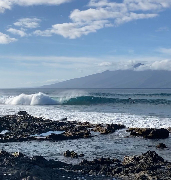 Very nice of them. SOMEHOW, watching a raggedy line of 80 or so surfers bobbing in scary -big swells, with larger swells visible on the horizon; twenty of them paddling for a wave that jacks up, will probably close out, one surfer throwing himself (not being sexist, him or herself then) into a freefall drop, catching enough fin and rail at the bottom, with the entire roof of a two story building coming down and on and over (and not just coming down, coming down with a vengeance and force beyond simple gravity), making a turn, weaving past or over several other surfers, sponge-bobbers, photographers), and getting just high enough on the face, with just enough forward momentum, to get, for a maximum of under five seconds, time in the most famous tube in the world; and, when and if you’re spit-shot out to the shoulder, you (notice I’ve switched it from third to second person) you get to claim it; two hands shaking or thrown to the heavens; and, if you’re really lucky, one of the helmeted photographers can put your image on INSTAGRAM, or SURFLINE can put your ride on its ‘CAM REWIND’ feature… and, if someone at Surfline actually knows who you are, your name might appear with the video; SOMEHOW, for someone trying not to concentrate on all that; having it going is both distracting and sort of SOOTHING.