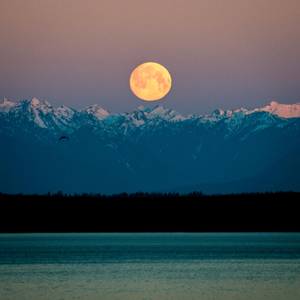 Surf Route 101, basically North-South, runs East-West through Sequim. This can cause full-on sun blindness. Without going into how the sun sets farther north in the summer than the winter*, and how September’s full moon aligned almost perfectly with the Autumnal Equinox, that time when day and night are of equal length**; as I was headed home, sipping on my chocolate milkshake, there was the moon; straight ahead; full, huge, hanging just above the highway in an empty, Maxfield Parrish sky; the entire visible surface gloriously reflecting our more distant sun.