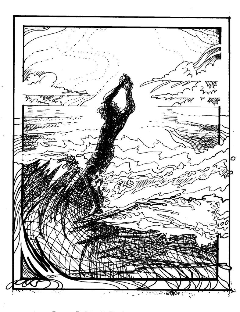 For those of us who never met Mr. O’Neill, but enjoyed the ever-increasing comfort and warmth as wetsuits continued to get less cumbersome and more comfortable, the image of the man is tied to the photo of the man in the eyepatch. This drawing is also derived from that image. Thanks for the warmth.