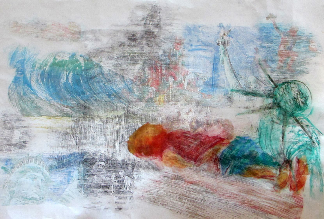 These portions of a work are the closest thing Melissa and I had to a collaboration. The pen and ink wave is mine. The little girl on the beach under it is from a photograph of Melissa when she was a little girl. I sort of believe the work was never quite completed, not to her satisfaction.
