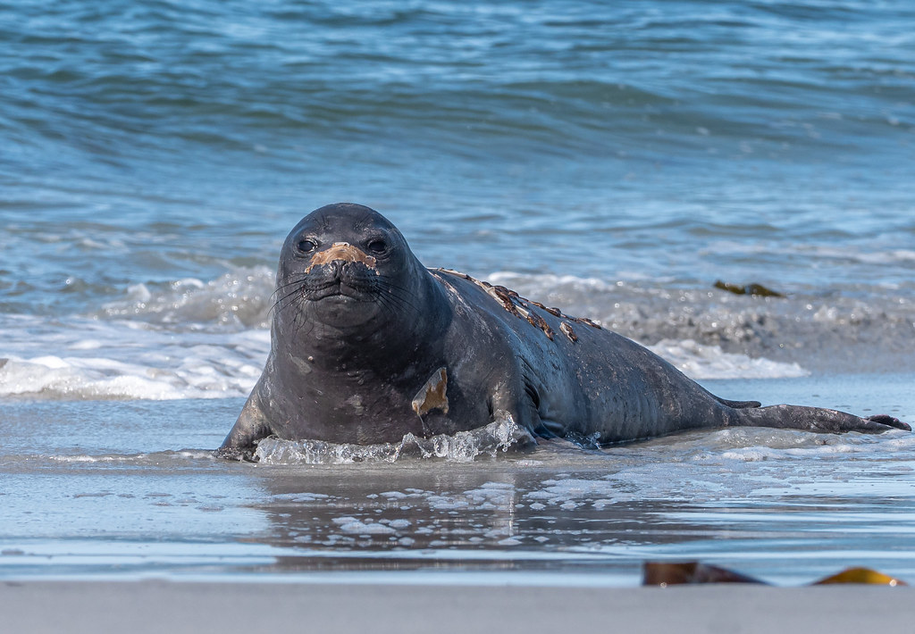 More like embarrassed. More so when a surfer, Kim, in street clothes but contemplating going out, ran over just as I pushed my board up onto the beach, then crawled my big ass self up behind it. I had to struggle to get my leash detached and the water out of my wetsuit, the last of the legs clamped securely around my ankles. Kim carried my big ass board up to my car while I lumbered my way behind her. Thanks, Kim, helping out the old guy.