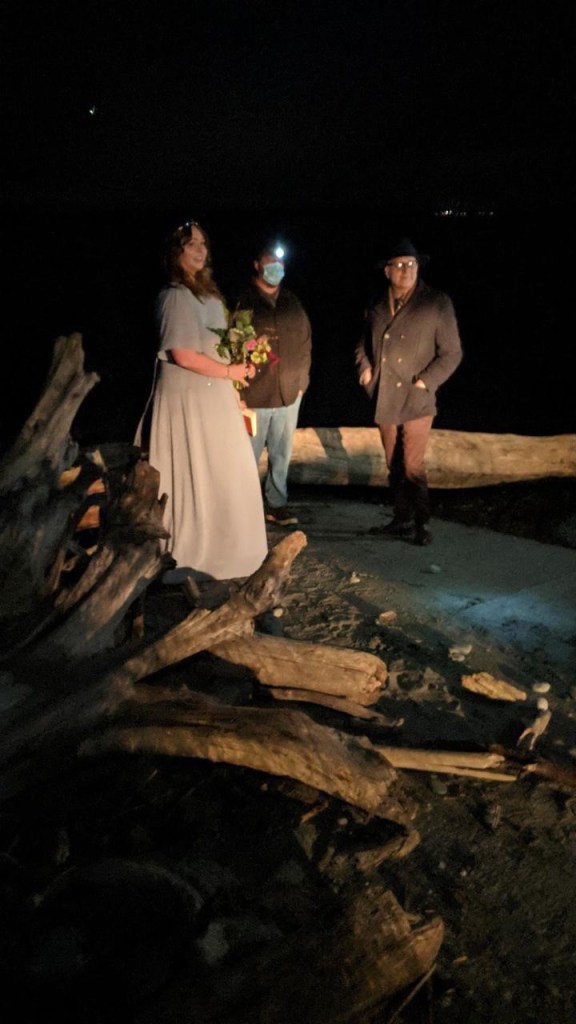 “Um. No.” So it was set for some time around 3:30 at the Point Wilson Lighthouse. Um, no. There was a traffic accident over by Cheney Stadium in Tacoma, then another one on the Jefferson County side of the Hood Canal Bridge. I got a call from Steve that the ceremony was going to happen about 4:30, and that the wedding and the party was all being moved to the beach over by the fairgrounds. “Okay. Yes, I’ll wear a mask. No, there’s no way I can upstage you. No hugging? No problem. I’m calling Keith. I told him about it, he’s going. We’re going to represent.”