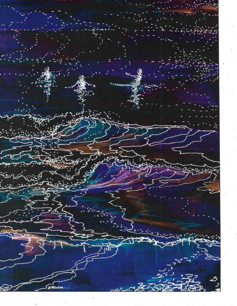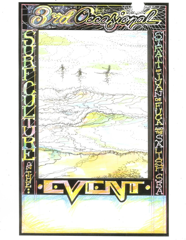 With all the time I spend at THE PRINTERY in Port Townsend, I can’t really explain why I didn’t get a scannable 8 &1/2 inch version of the white and black version of my third attempt to draw a bottle on a beach. BECAUSE of an accident in which the illustration part of the poster was reversed, color-wise, with some very interesting results, I attempted to add some color to what would otherwise be black background. Two attempts, with the colors from the first used as a sort of chart to narrow the palette for the second. Purple becomes kind of, almost yellow, green becomes one shade of blue- like that.