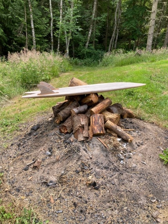 Here’s the story, in photos: Adam “Wipeout” James shaped the board from a cedar slab last year with the intention of sacrificing it on the Summer Solstice, the goal being to improve the waves in the northwest. Those are his two boys posing with the quite obviously rough-shaped board. EMMET (yeah, that’s how they spell it), top, and Calvin, nicknamed Boomer, bottom. Somehow that pagan burning didn’t happen, but this year, yeah. The board was on the fire at Joel’s house, June 21, 2023, ready to go.