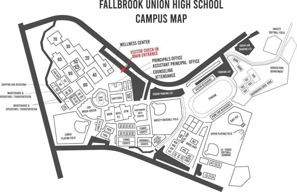 The arrow in this map of the actual Fallbrook Union High School campus pretty much points to the place where most of this chapter in the fictional story takes place.
