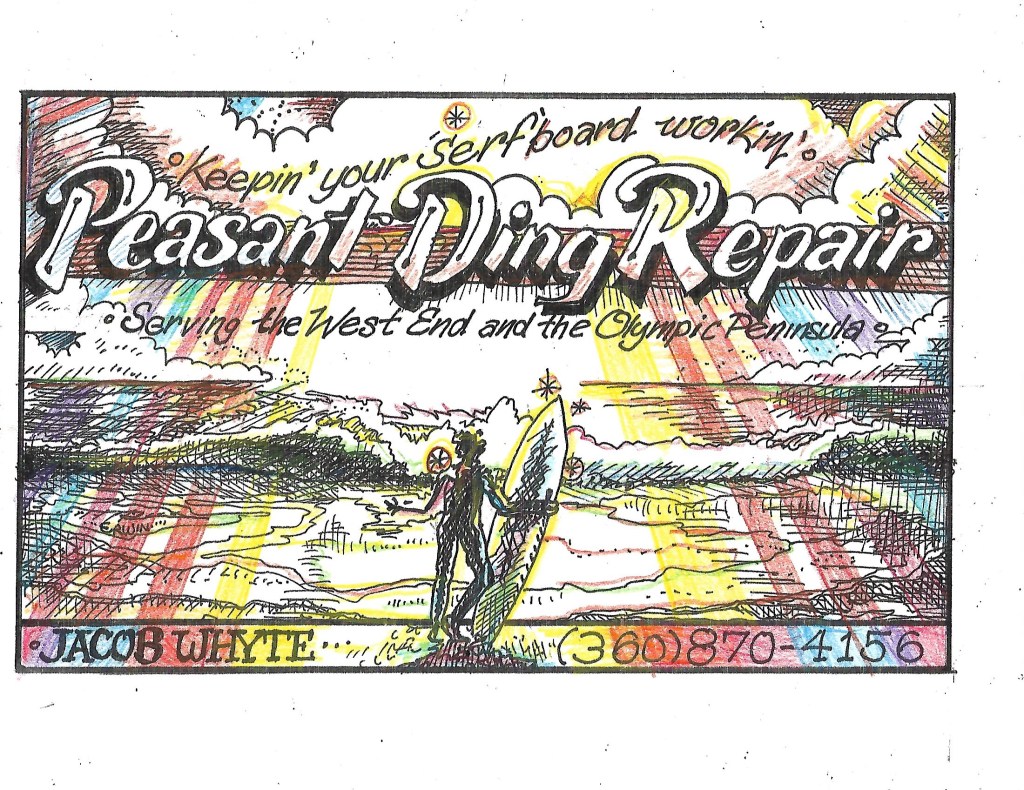 “It isn’t,” Jacob said when I actually got in phone contact, he at a far northwest secret surf location, me in the depths of a housing tract in East Bremerton. Didn’t matter, so much, I’d already done a drawing, black and white, printed a copy and colored it, either suitable as a flyer, or, reduced in size, a too-busy business card. “Yeah, Erwin, maybe the ‘serfboard’ thing is expecting too much of… surfers.” “Okay, how about the ‘serving the West End and the Olympic Peninsula’ part?” “Yeah. Sure.”