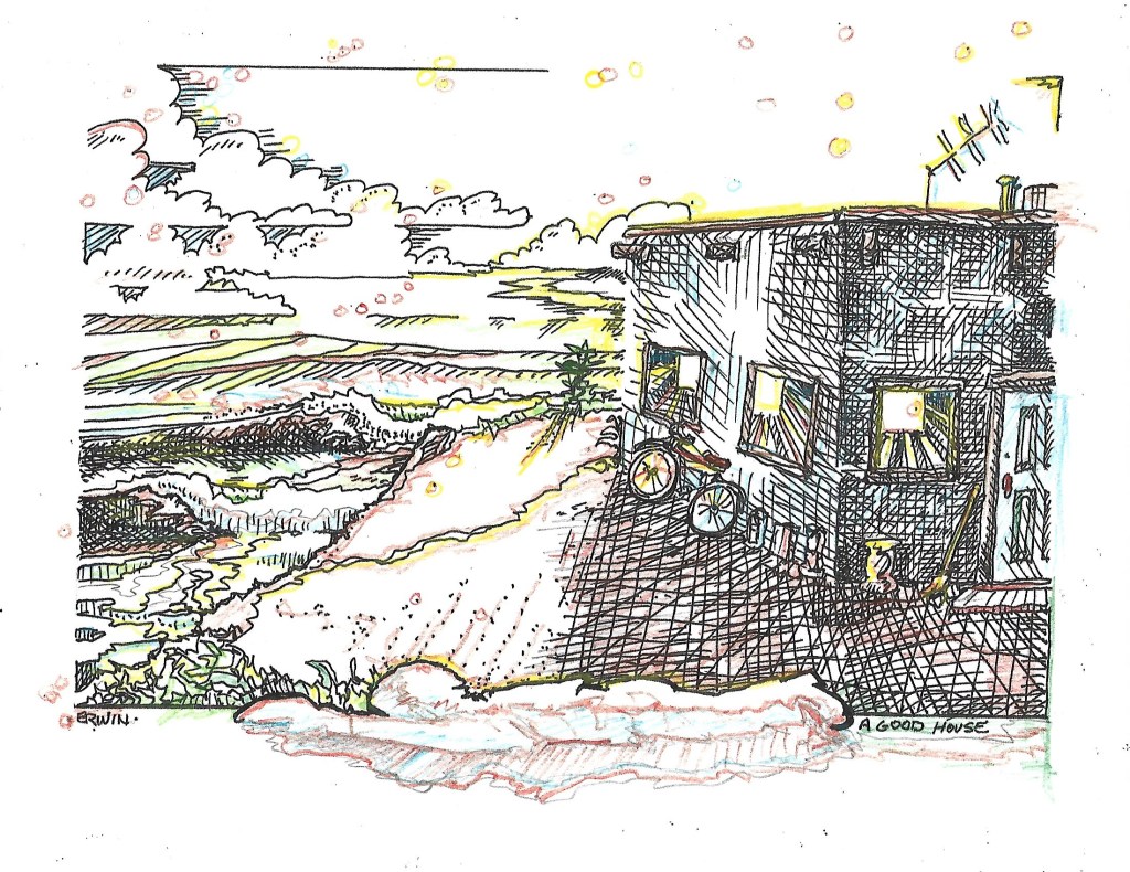 OH, since the location could be anywhere, on this (new) illustration (sketch if you must), I put in some waves in the background, making, possibly, A GOOD HOUSE that much better.