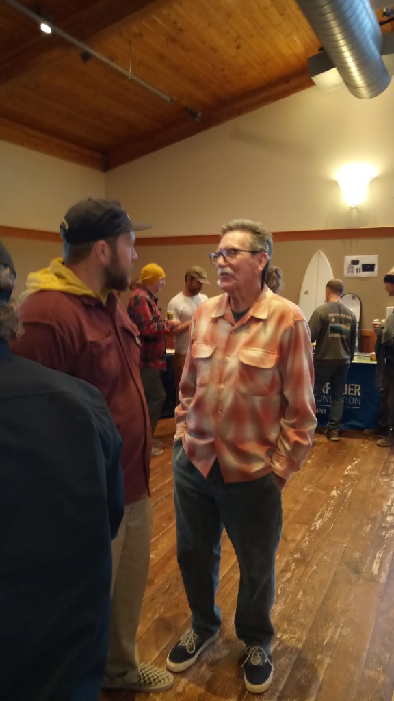 Legendary Olympic Peninsula path(wave)finder Darryl Wood (please forgive me if his name is misspelled), chatting with the important guy from the first photo. Darryl was the first surfer I met when I moved to the northwest in late 1978. The Hood Canal Bridge sank on Tuesday, February 13th. The state set up a passenger only ferry service, and Darryl and I were part of the first day’s riders on Monday, February 19. He was working for a contractor at Puget Sound Naval Shipyard, I was a painter. He did mention something about Jesus to someone, not me, and must have said something about surfing, because, the next Saturday, February 24, decked out in a diver’s suit, crotch strap and all, with no hood, no booties, my sister’s surfboard (I’d sold all of mine), California wax, I was in the lineup at a spot you can no longer (legally) access directly. It was 38 degrees on the beach and my board kept flying out from between my legs. I caught a couple of waves, but he drop was so quick, I ended up kneeboarding. Yeah, sign of things to come.