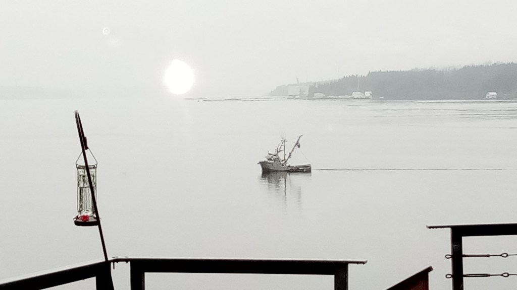 Top to bottom: Beaver moon from my front yard; my front yard; gillnetters on the Hood Canal from someone else’s back porch (waterfront people call the water side the front, but…); and a shot courtesy of Keith Darrock of the Olympics over the hedge and the fog- Yeah, Autumn, we’re in it. Waves on the Strait? No comment, no images. Another example of when not sharing is a practical alternative to total denial. Still, no waves is policy as well as almost always true.