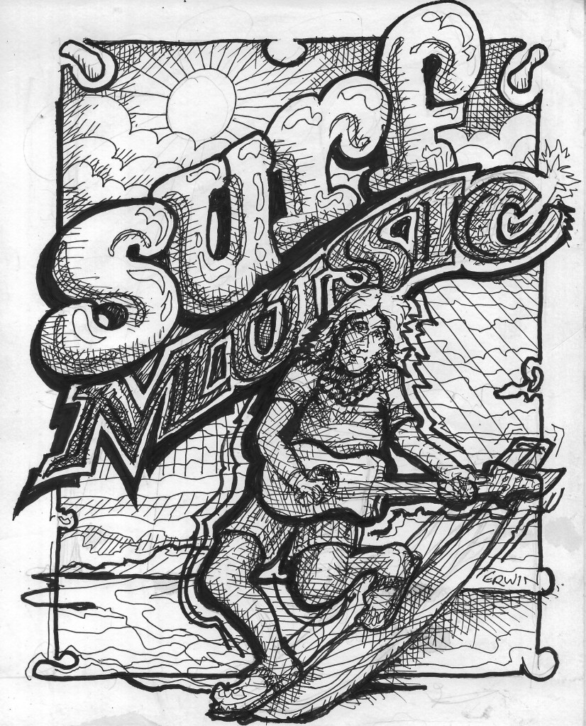 Port Townsend surfer/librarian Keith Darrock and I have not gotten it totally together in organizing the next OCCASIONAL SURF CULTURE ON THE STRAIT OF JUAN DE FUCA EVENT. However, it will be centered on the connection between surf and music, with, of course, surf artists and storytellers, as well as PETE RAAB, expert in all the background, history, and wonder of surf music. The event will be part of the summer library lineup, and… and we better get to work jockeying for position. This sketch probably won’t be part of the poster. SKETCH. We’ll see.